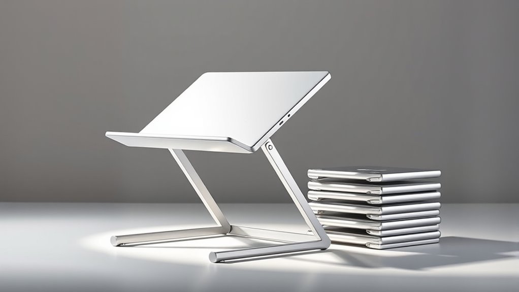 Choosing a foldable aluminum lapstand with excellent cooling and ventilation is essential for maintaining ideal device performance. Open designs, ventilation holes, or hollow panels help promote airflow around your laptop, preventing overheating. Aluminum alloy acts as a heat sink, quickly dissipating heat and reducing thermal buildup during extended use. Multi-support structures like dual hands or X-shapes increase space beneath your device, enhancing airflow. Many foldable lapstands also feature adjustable angles or heights, which often include ventilation improvements to optimize airflow regardless of configuration. Proper heat dissipation not only keeps your laptop cool but also extends its lifespan by reducing thermal stress. When selecting a lapstand, prioritize those with well-designed ventilation features to ensure your device remains cool and runs smoothly during prolonged work sessions.