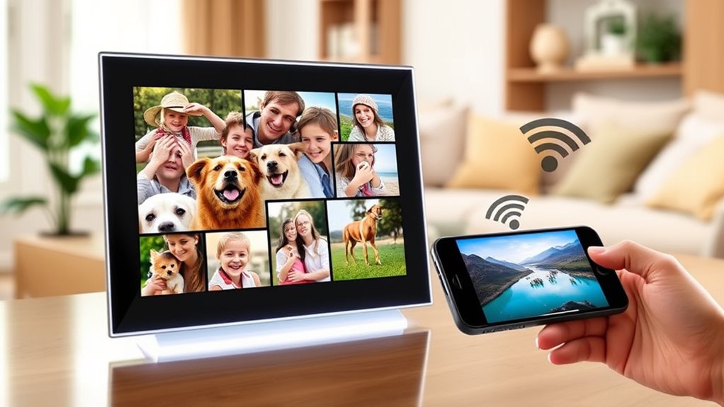 When considering how your digital photo frame displays images, connectivity options play a vital role in simplifying the sharing process. Most frames supporting email sharing have a unique email address assigned, making it easy to send photos directly. Many models enable remote photo sending via email, so you can share images without connecting physically. Wi-Fi connectivity is essential for this feature, allowing the frame to receive images from anywhere with internet access. Some frames support multiple email accounts or user profiles, perfect for sharing with family or friends. Security features like password protection or secure login are often included to prevent unauthorized access when sending photos. Overall, versatile and secure connectivity options make email photo sharing seamless and convenient.