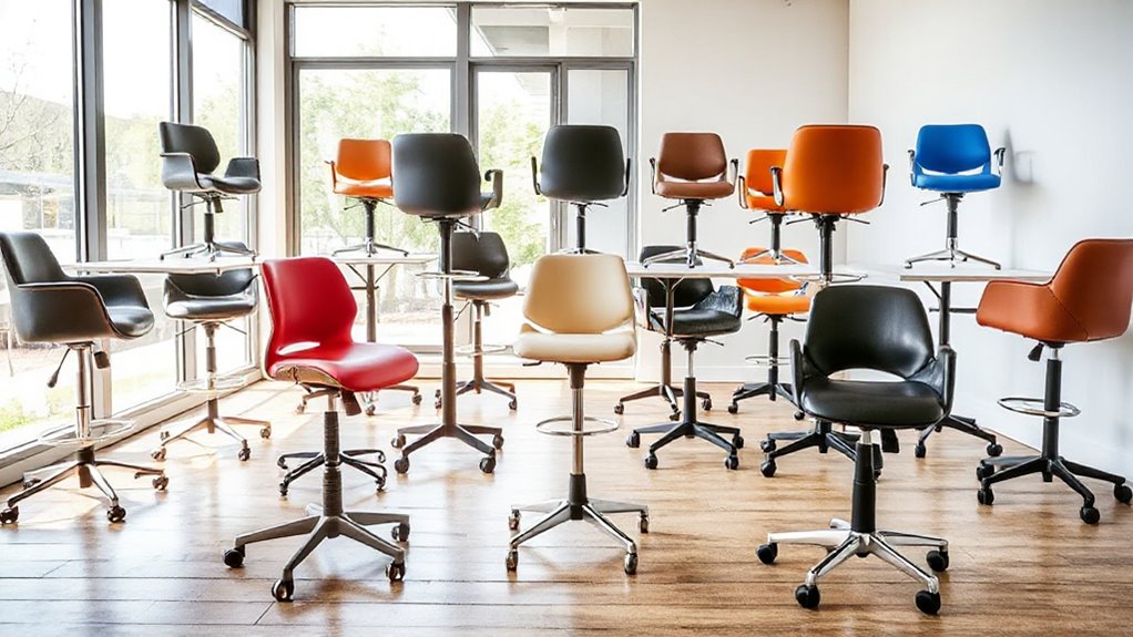 Height adjustability features are essential for anyone using drafting chairs with standing desks, as they allow me to tailor the chair’s height to my workspace. I appreciate how many chairs come equipped with pneumatic lift mechanisms, making height adjustments smooth and effortless. This adaptability accommodates various desk heights, typically ranging from 22.8 to 56.6 inches, ensuring I can find my ideal position. I also love the adjustable foot rings, which provide extra support for my legs, enhancing comfort during long work sessions. Some models offer up to 8 inches of height adjustability, catering to diverse user needs. Overall, proper height adjustability not only promotes better posture but also helps reduce fatigue and discomfort while I switch between sitting and standing.