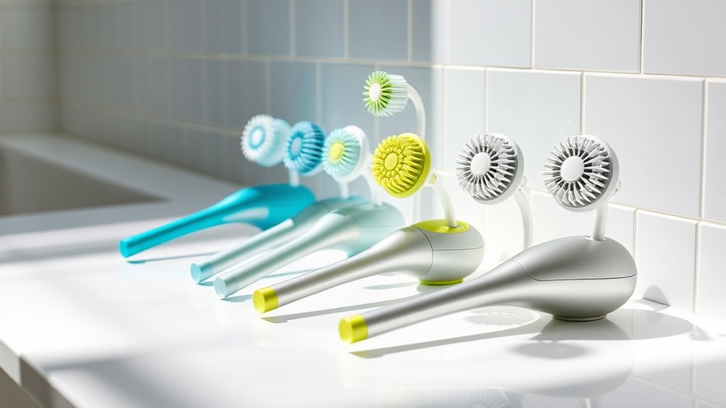 A versatile electric spin scrubber becomes truly effective when it offers multiple brush heads designed for various surfaces and cleaning tasks. I look for models that include flat, pointed, corner, sponge, and soft brushes, so I can switch easily between grout, tiles, bathtubs, and delicate surfaces. High-quality brush heads with durable bristles prevent scratching and stay effective over time. Some scrubbers feature washable or recoverable heads, which help extend their lifespan and keep things hygienic. Compatibility is key—being able to swap out heads for specific tasks makes cleaning more efficient and tailored to my needs. This versatility guarantees I can tackle stubborn stains and different surfaces with confidence, making my cleaning routine quicker and more thorough.