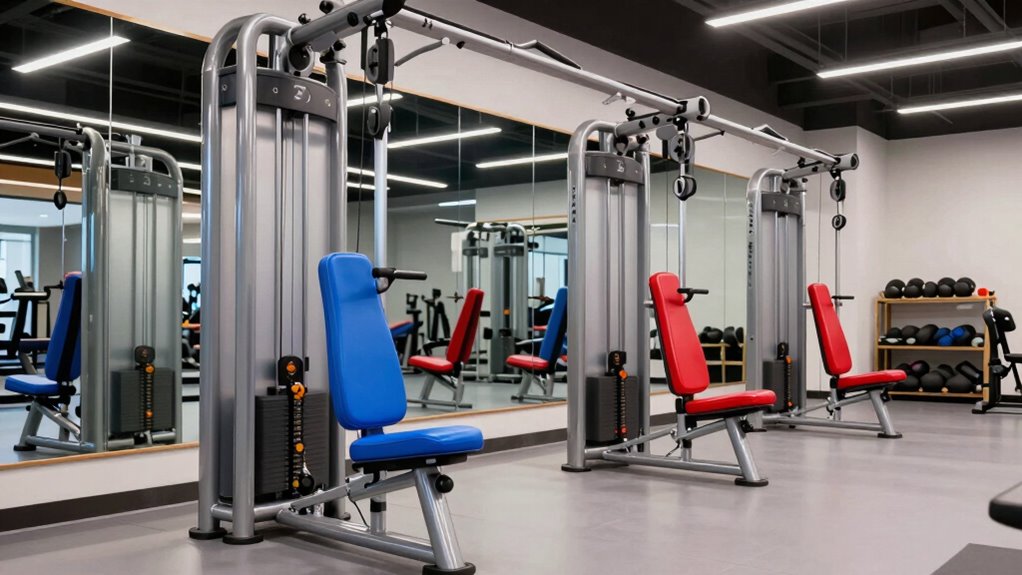 Choosing the right space for a functional trainer machine requires careful measurement of your available area. I always start by measuring the floor space and ceiling height to guarantee the machine fits comfortably without blocking movement or nearby equipment. It’s important to take into account the machine’s footprint and whether it can be easily moved or stored, especially in small or multi-purpose rooms. I also check if the dimensions, including attachments and pulley systems, align with the workout area to prevent overcrowding. Additionally, I evaluate the wall or floor mounting requirements to confirm your space can support installation and stability. For limited spaces, opting for space-efficient designs like foldable or wall-mounted models can maximize usability without sacrificing functionality.
