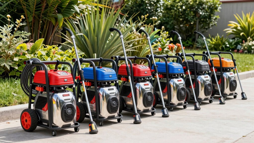 Portability and size are essential factors to contemplate because they directly impact how easily I can move and store a gas pressure washer. Compact models are usually lighter and easier to carry, making them ideal for quick jobs or limited storage space. Weighing under 75 pounds, lighter units are manageable for one person to transport without much hassle. Large, rugged wheels, like 10-12 inch pneumatic tires, boost mobility across uneven terrain, which is vital for outdoor use. Foldable or removable handles also help maximize storage efficiency, especially in tight spaces or when transporting in a vehicle. Overall, the design and dimensions of a pressure washer determine how conveniently I can handle it on-site and store it when not in use, making portability a key consideration.