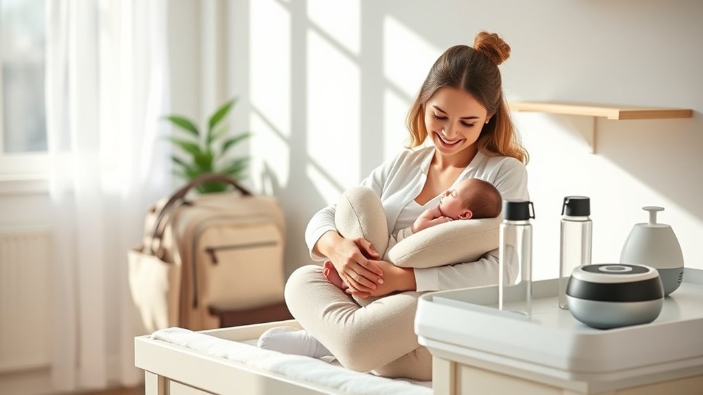 Practicality and usefulness are key factors to contemplate when choosing gifts for new moms in 2025 because these items can genuinely ease daily routines and enhance comfort. Items that serve a functional purpose, like supportive socks or nursing accessories, make everyday tasks simpler and more manageable. Gifts that promote relaxation or self-care, such as candles or spa products, help new moms unwind during challenging postpartum days. Reusable items like personalized drinkware or keepsake ornaments provide lasting value and can be integrated into daily life. Choosing versatile gifts that fit into a new mom’s routine ensures they remain relevant and appreciated over time. Ultimately, thoughtful, practical gifts can offer both comfort and convenience, making her journey into motherhood a little easier.