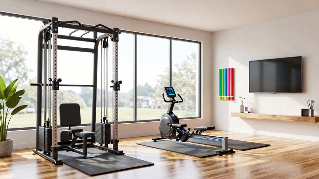 Ever wonder how safe your workout environment can be? These home gym systems come with essential safety features like padded bars, non-slip mats, and adjustable components to prevent injuries. Many also include safety locks and emergency stop mechanisms. I feel confident knowing these features help protect me during intense sessions. Don’t you want to guarantee your workout space is as safe as it is effective? Safety should always come first in your fitness journey.
