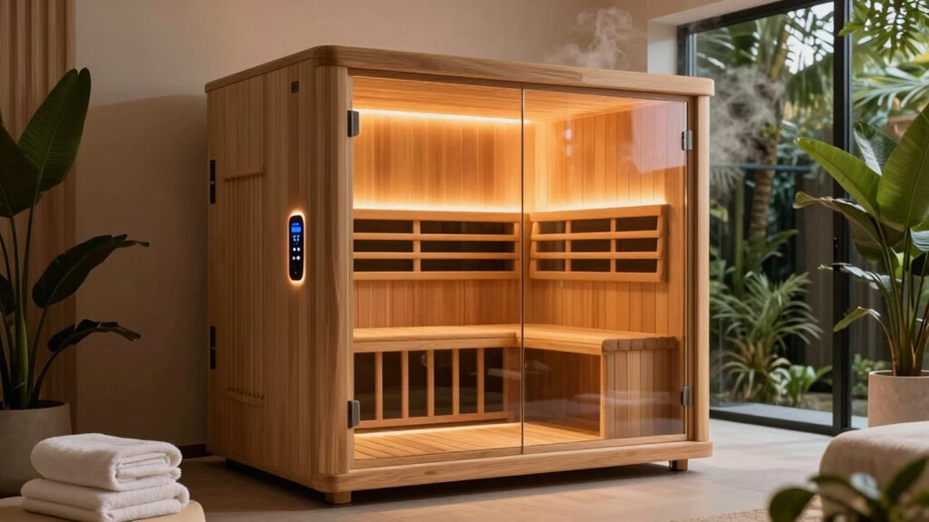 Adding the right features can considerably elevate your infrared sauna experience, making relaxation more enjoyable and therapeutic. Bluetooth speakers and LED lighting create a soothing environment, while built-in chromotherapy with multiple colors may boost mood and provide additional health benefits. Convenience features like remote controls and easy-to-clean surfaces make daily use simpler and more enjoyable. Safety is essential, so look for saunas with automatic shut-off, temperature protection, and low EMF levels for peace of mind. Accessories such as foldable chairs, foot pads, and storage pockets enhance comfort and organization, transforming your sauna session into a customized retreat. When selecting a sauna, consider these additional features to guarantee it fits your lifestyle, maximizes relaxation, and promotes safety.