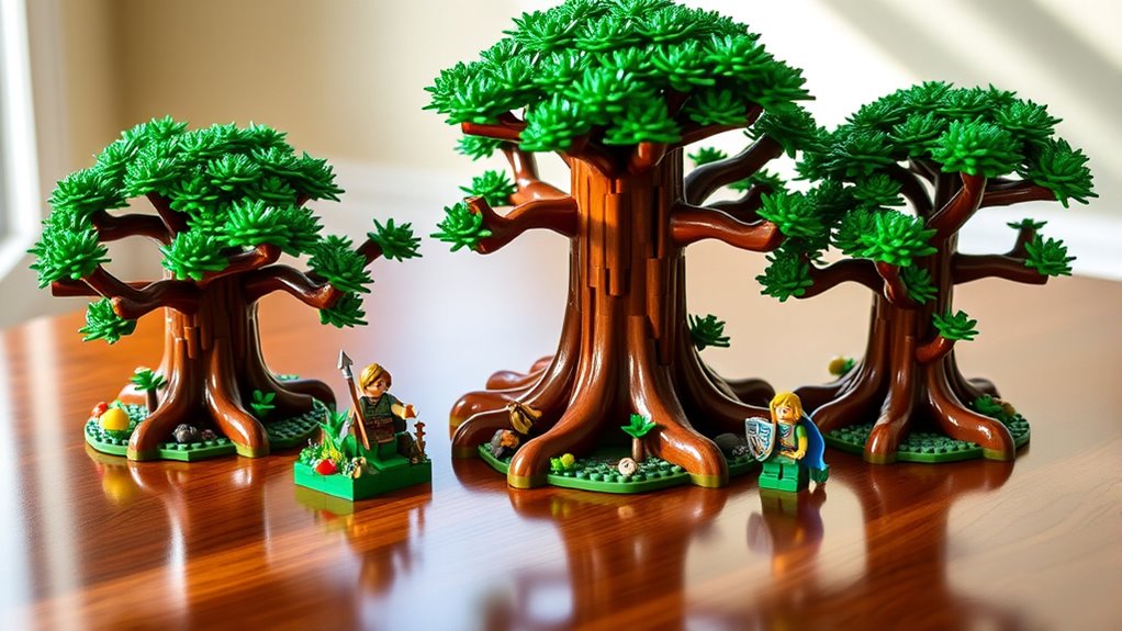 Selecting a durable Lego Zelda Great Deku Tree set means paying close attention to the quality of its materials. High-quality ABS plastic is typically used, which resists impact and wear, guaranteeing the set lasts over time. The longevity depends on the thickness and overall quality of these plastic parts, so choosing sets with reinforced connections or interlocking pieces can boost durability. Proper handling and assembly are vital; rough treatment can lead to cracking or damage. Regular cleaning and careful storage also help maintain the plastic’s condition, extending the set’s lifespan. When evaluating options, look for sets that emphasize strong, impact-resistant materials and sturdy construction. These factors guarantee your Lego Zelda Great Deku Tree will remain intact and enjoyable for years to come.