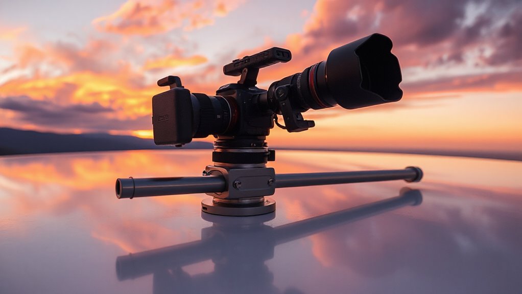 The durability and stability of a motorized camera slider can make all the difference in your shooting experience. When choosing a slider, I always pay attention to the materials used. Aluminum alloy is a popular option for its balance of strength and weight, ensuring stable operation during my shoots. However, I often lean towards carbon fiber sliders for their incredible strength-to-weight ratio, which minimizes vibrations and enhances stability. It’s also vital to take into account the slider’s payload capacity; heavier materials can support larger camera setups without sacrificing performance. Finally, I look for features like roller bearings that guarantee smooth and reliable movement, helping to reduce camera shake and resulting in smoother shots.