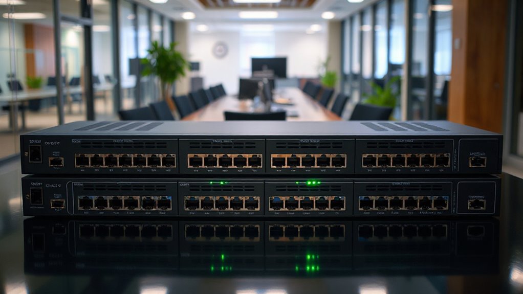 When you evaluate managed network switches, one critical aspect to take into account is their network security options. Features like VLAN support allow me to segment traffic, isolating sensitive data from general network activity. This enhances security considerably. I also look for IGMP Snooping, which optimizes multicast traffic by guaranteeing data packets reach only the devices that need them, reducing unnecessary exposure. Port Mirroring is a must-have for monitoring and analyzing traffic, helping me detect potential threats quickly. Additionally, Loop Prevention features are essential to avoid broadcast storms that could lead to network outages. Finally, advanced QoS settings guarantee that important applications maintain performance, even when the network gets congested. These features collectively fortify the network’s security.