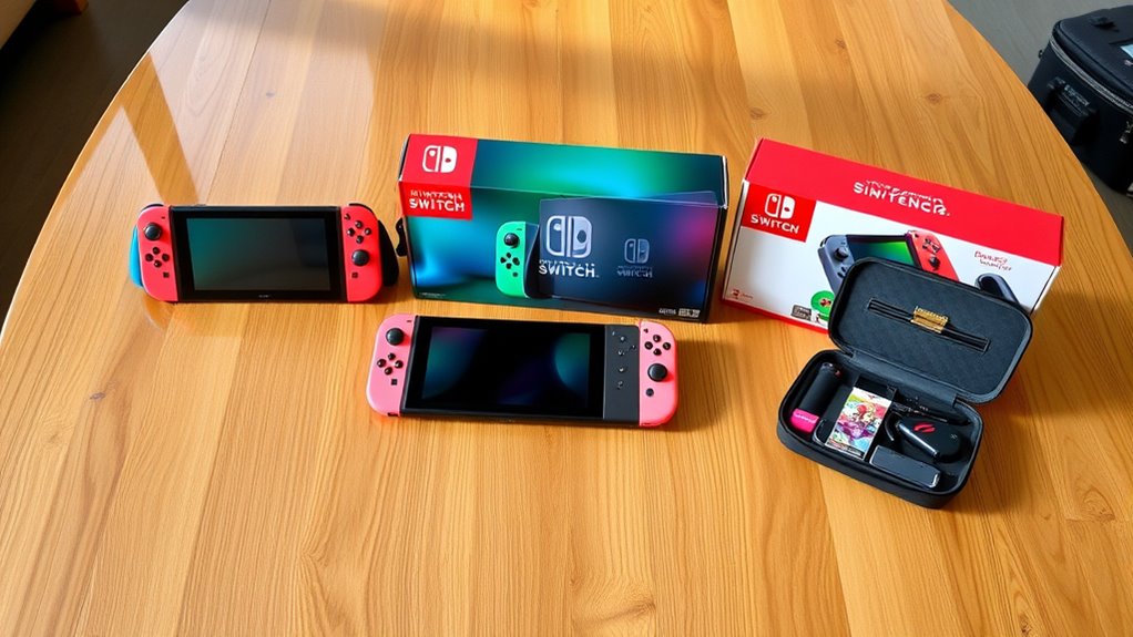When selecting a Nintendo Switch 2 bundle, considering additional features can markedly boost your gaming experience and protect your investment. Protective cases and screen protectors help keep the console safe from scratches and damage, reducing repair costs. Gaming accessories like grips, steering wheels, and thumb caps improve comfort and precision, making gameplay more enjoyable. Extra storage options such as game card cases and organized compartments support portability and quick access to multiple games and accessories. Charging docks and multi-controller setups enable seamless multiplayer sessions, enhancing social gaming. Bundles that include these features not only extend your console’s lifespan but also increase overall satisfaction. By choosing bundles with these benefits, you’ll enjoy a more durable, comfortable, and versatile gaming experience.
