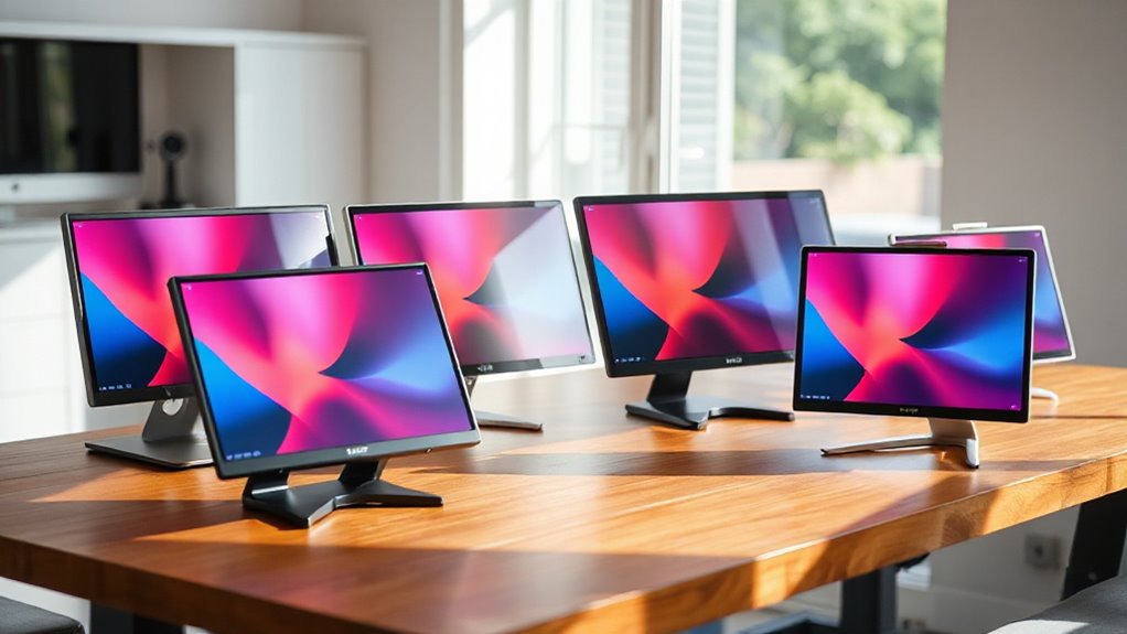 As I explore portable monitors with batteries, compatibility with my devices quickly becomes a top priority. I want to verify my monitor supports a variety of devices, like laptops, smartphones, and gaming consoles, to maximize its utility. I look for options that offer both wireless connectivity, such as AirPlay and Miracast, and wired connections like HDMI and USB-C. It’s essential to confirm that the monitor’s connectivity features match the ports on my devices, especially if I’m aiming for touchscreen capabilities. Also, I need to check compatibility with operating systems like Windows, macOS, Android, and iOS. Finally, I appreciate monitors that easily switch between duplicate and extend modes, enhancing my multitasking and productivity across different devices.