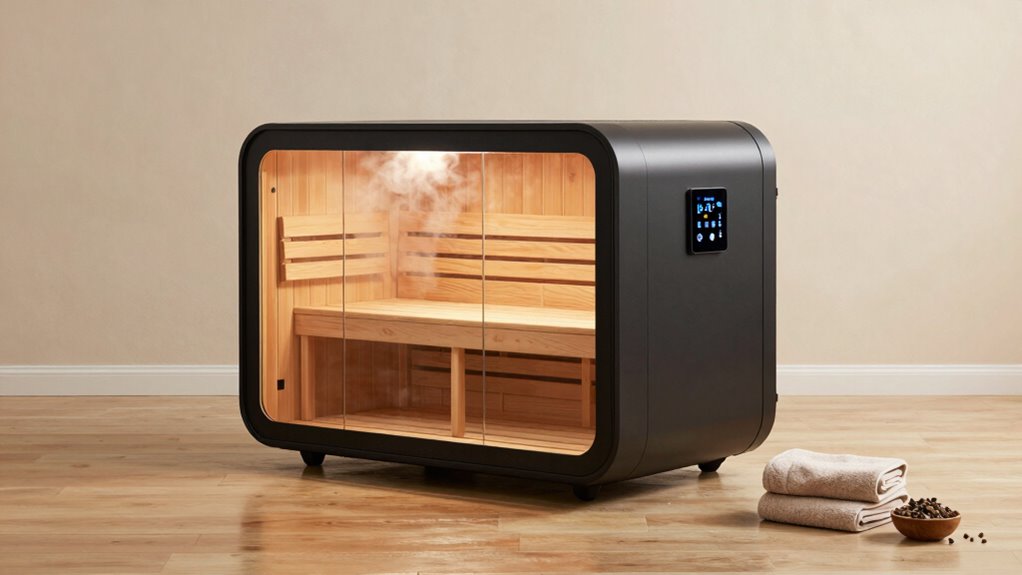Choosing a portable steam sauna means considering how easily you can set it up, move it, and store it. Most models assemble in under 10 minutes, so you won’t waste time getting started. Their foldable designs make storage simple, fitting into small spaces like bedrooms or bathrooms. Weights typically range from 13 to 28 pounds, so you can carry them without much effort, even by yourself. The compact size allows you to enjoy a sauna in various locations—whether at home, in an apartment, or at the gym. Plus, features like remote controls make adjusting settings straightforward, adding to the convenience. Overall, the portability benefits guarantee you can enjoy your sauna anytime and anywhere, without the hassle of bulky equipment or complicated setups.