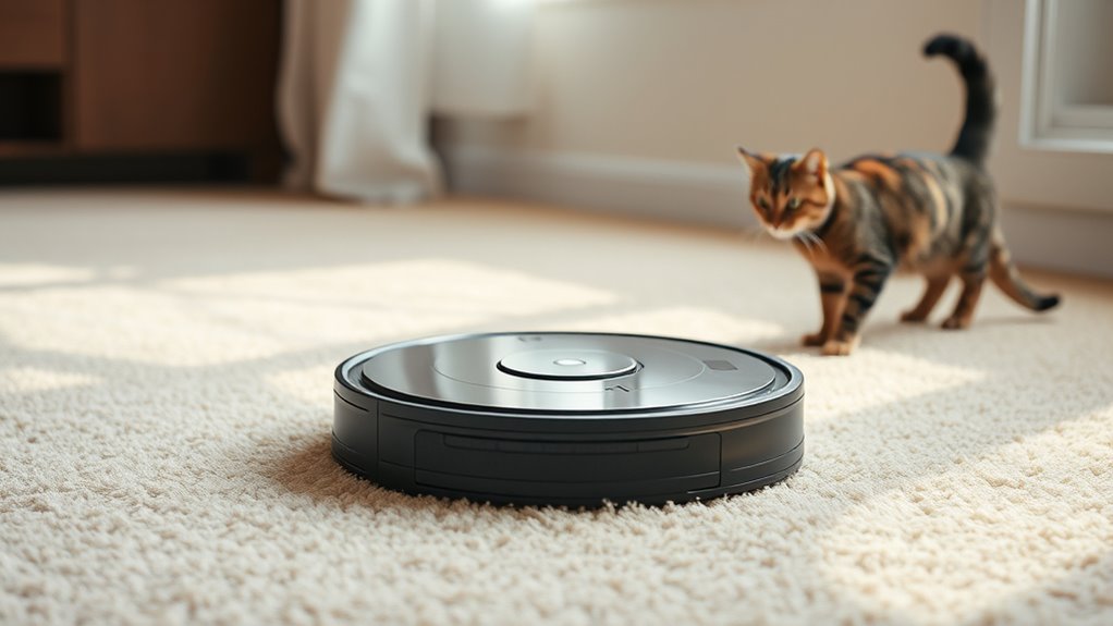 Effective navigation and obstacle avoidance are key to ensuring my robot vacuum thoroughly cleans pet hair without getting stuck or missing spots. Advanced systems like LiDAR and PreciSense map my home in detail, helping the vacuum optimize its cleaning path and avoid furniture or cords. Obstacle detection sensors actively identify objects like pet toys or fragile decor, so the vacuum can maneuver around them safely. Reactive obstacle avoidance technology allows for real-time adjustments, keeping the cleaning smooth and continuous. Precise mapping and recognition reduce missed areas and prevent collisions with delicate items or pet belongings. Some models even let me set no-go zones or virtual barriers, which is perfect for keeping the vacuum away from pet accessories or fragile objects, ensuring a thorough and safe clean every time.