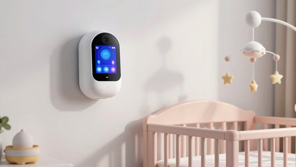 Choosing a smart baby monitor with excellent video quality means paying close attention to several key features that guarantee clear, detailed visuals. Higher resolution cameras, like 2K or 1080p, ensure you see every detail of your baby and nursery clearly. Night vision with infrared technology allows you to monitor in low-light or dark conditions without disturbing your little one. Optical zoom helps you enlarge specific areas without losing clarity, while wide-angle lenses—often 120° or more—capture a broader view, reducing blind spots. Digital zoom and remote panning or tilting functions enable close-up inspections from a distance while maintaining high quality. These features work together to provide crisp, reliable visuals, giving you peace of mind and a clearer picture of your baby’s environment at all times.