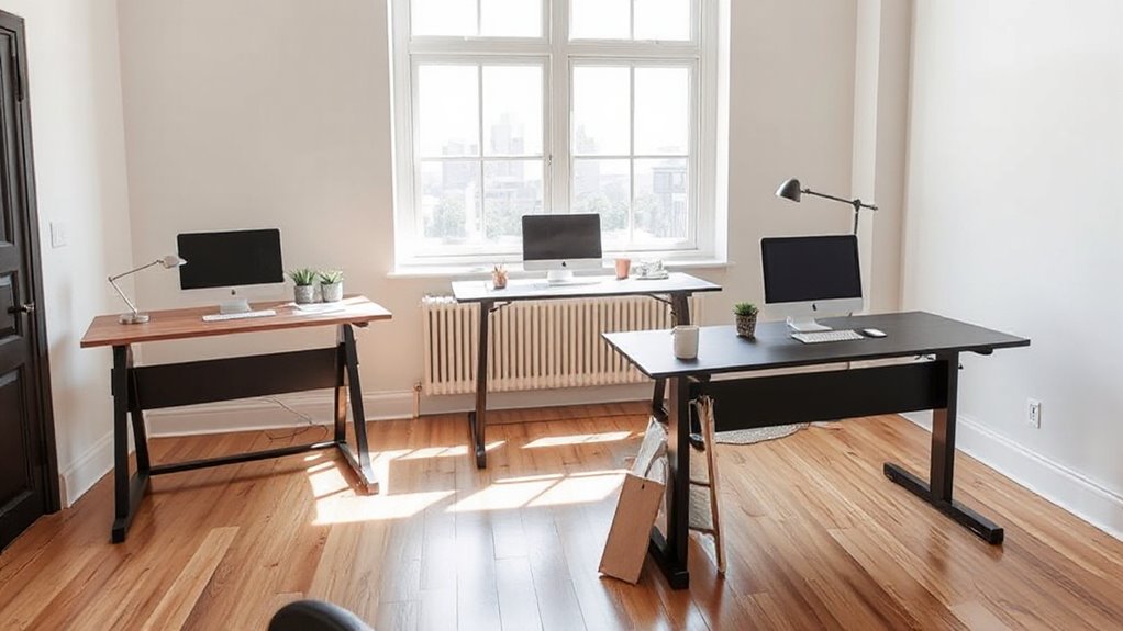 While exploring options for standing desks in small spaces, I’ve realized that the height adjustment mechanism plays an essential role in usability and comfort. I found that options range from manual cranks to electric motors, with electric models offering smoother and quieter shifts. Many of these desks even come with programmable memory presets, allowing me to save my preferred heights for easy switching between sitting and standing.