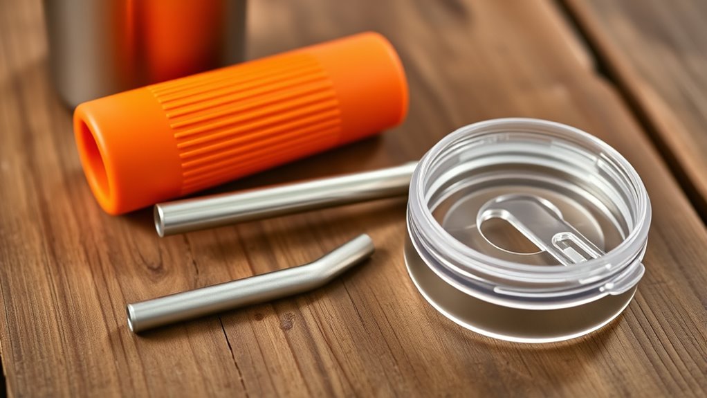 Ensuring your Stanley tumbler accessories are built from durable materials is essential for long-lasting performance. High-quality silicone and BPA-free plastics are ideal choices, as they resist cracking, tearing, and deformation over time. Reusable, flexible materials also withstand regular use without losing their shape or integrity. It’s important to select accessories made from materials resistant to water, dust, and UV exposure, ensuring they hold up in various environments. Strong materials enhance impact resistance, so your accessories can survive drops or rough handling without damage. Additionally, opting for corrosion-resistant and non-toxic options guarantees safety and durability for daily hydration. Prioritizing material durability means your accessories will stay functional and looking great, no matter how often you use or transport your tumbler.