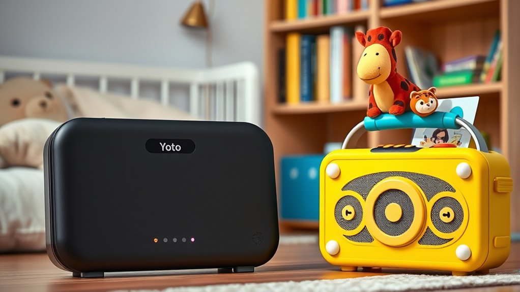 Just like David and Goliath, choosing between the Yoto Player and Toniebox comes down to your child’s unique needs. Both have their strengths, but ultimately, it’s about finding the perfect fit — a trusty slingshot for their imagination. As I’ve seen firsthand, the right choice can reveal a world of wonder, turning bedtime stories into epic adventures. So, trust your instincts; the right device will be your child’s own hero’s sword.