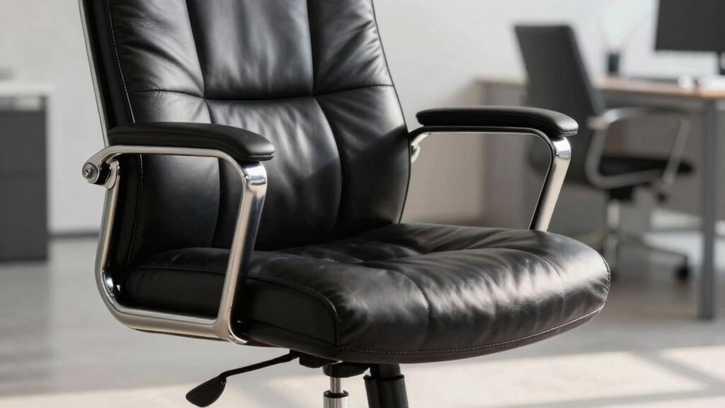 If you worry that larger chairs lack ergonomic features, think again. Many models include adjustable armrests and lumbar support, designed specifically for bigger users. You can customize the height and angle to fit your body perfectly, reducing strain during long work hours. These features guarantee comfort and support, helping you stay focused and productive. With the right chair, you’ll feel both supported and confident, no matter your size.