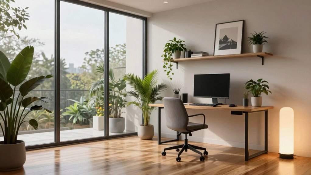You’re choosing eco-friendly materials like sustainable furniture, which minimizes environmental impact and adds a modern touch to your workspace. Biodegradable accessories, such as plant-based organizers and biodegradable pens, are also trending, helping you reduce waste. These materials not only promote sustainability but also create a healthier, more inspiring environment. By integrating these eco-friendly options, you’re making a positive change while designing a stylish, functional home office.