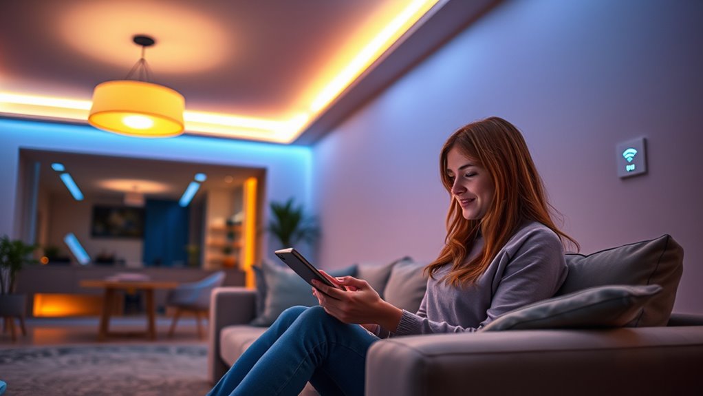 Li-Fi uses visible light from LED bulbs to transmit data, offering a more secure and energy-efficient alternative to Wi-Fi, which relies on radio waves. Since Li-Fi signals are confined to illuminated spaces, they reduce outside hacking risks but require direct line-of-sight, limiting coverage. As technology evolves, improvements in security and range are underway. Keep exploring to discover how Li-Fi could transform your home internet experience.