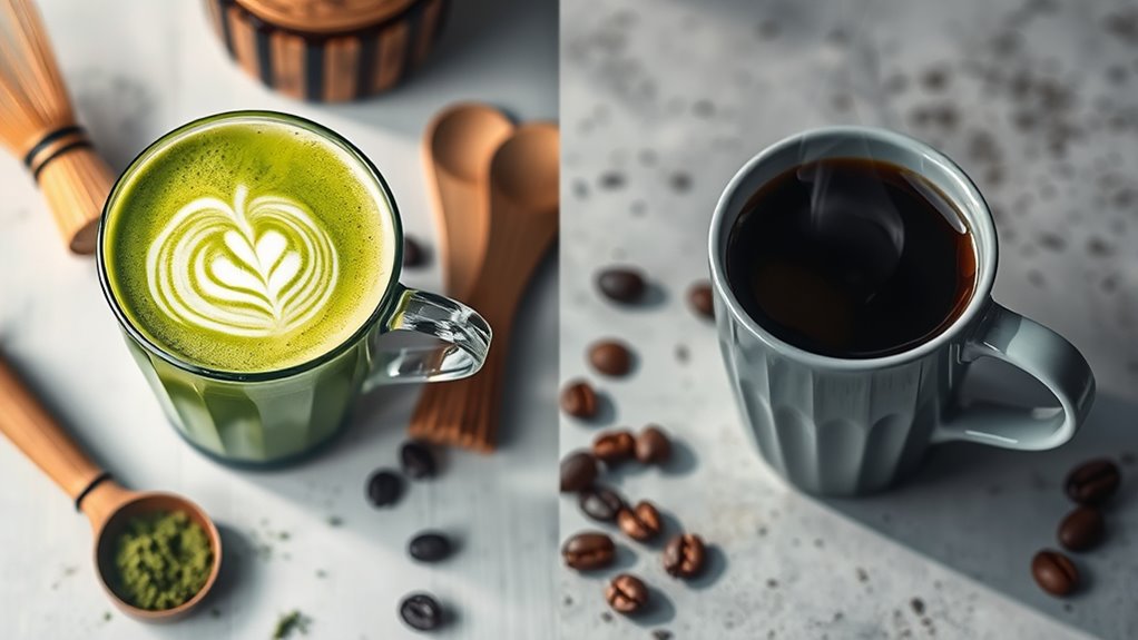 When comparing matcha and coffee, you’ll find each offers distinct benefits and drawbacks. Coffee gives you a quick energy boost, but it can lead to jitters and crashes. Matcha provides a steadier release of energy, keeping you focused without the sudden dips. Plus, it has more antioxidants, promoting better health. However, coffee’s brewing ritual is a beloved routine for many. Interested in uncovering the finer points of each beverage’s impact on your daily life?