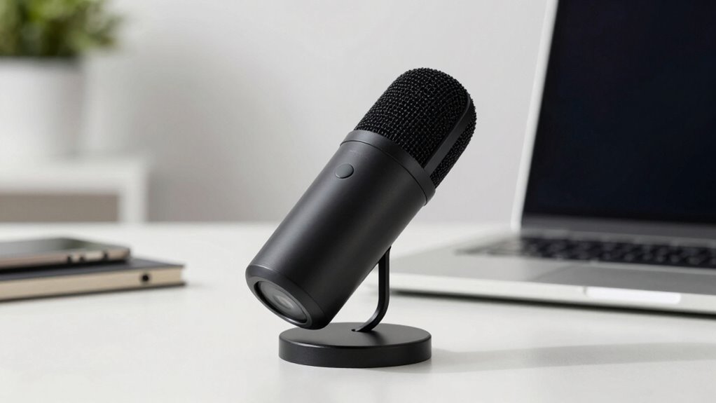 The quietest video calls start with proper microphone placement. Position your mic at mouth level, about 6-12 inches away, and use a directional or cardioid mic to focus on your voice. Keep it away from noisy objects and vents. Avoid placing it too close, which causes distortion, or too far, which muffles sound. Small adjustments make a big difference. Continue optimizing your setup to guarantee professional, clear audio every time.