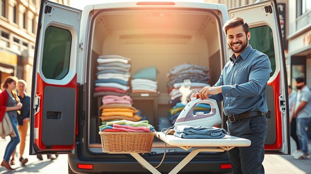 Mobile laundry and ironing services make your life easier by offering pick-up and delivery right at your door. You can schedule your laundry through an app or website, saving time and hassle. Professionals use high-quality, eco-friendly products to clean your clothes and handle delicate fabrics with care. Plus, you can have your garments expertly pressed, ensuring you’re always looking sharp. Interested in learning about the other benefits these services can bring to your routine?
