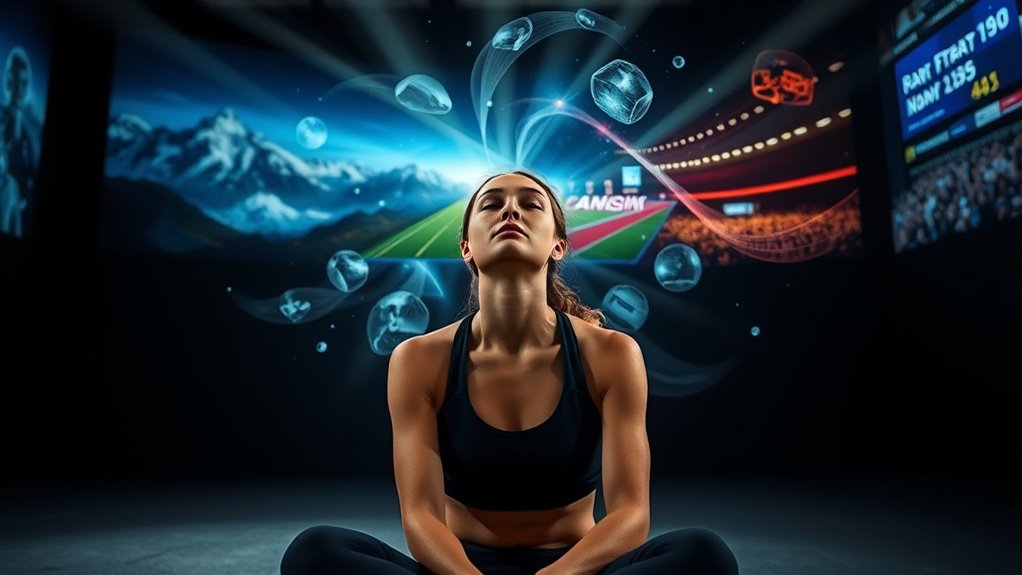 Imagine a sprinter mentally rehearsing her race, focusing on imagery clarity to perfect each move. Not all Olympians use the same visualization methods; they tailor mental rehearsal to their needs. Some emphasize vivid imagery to build confidence, while others focus on calming techniques. The key is consistency. You can adopt this approach by practicing mental rehearsal daily, enhancing imagery clarity, and customizing techniques to boost your performance.