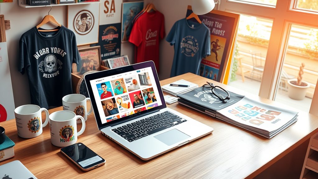 To sell print-on-demand products without paid ads, focus on building your brand through authentic storytelling, consistent visuals, and engaging content. Use social media to connect with your audience by sharing behind-the-scenes moments and customer stories, encouraging user-generated content. Optimize your website with relevant keywords to improve organic search visibility. Collaborate with genuine influencers and prioritize excellent customer service. Keep expanding your organic reach, and you’ll see growth—discover more strategies to elevate your success.
