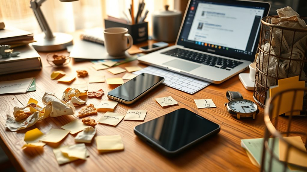 To quickly neutralize procrastination triggers, start by identifying what causes you to delay—such as cluttered spaces, distractions, or negative mindsets. When you notice these cues, pause and make immediate adjustments like tidying up your environment, turning off notifications, or reframing your thoughts. Recognizing your habits helps you control them more effectively. To discover more effective strategies and fine-tune your approach, explore additional tips that can keep you on track.